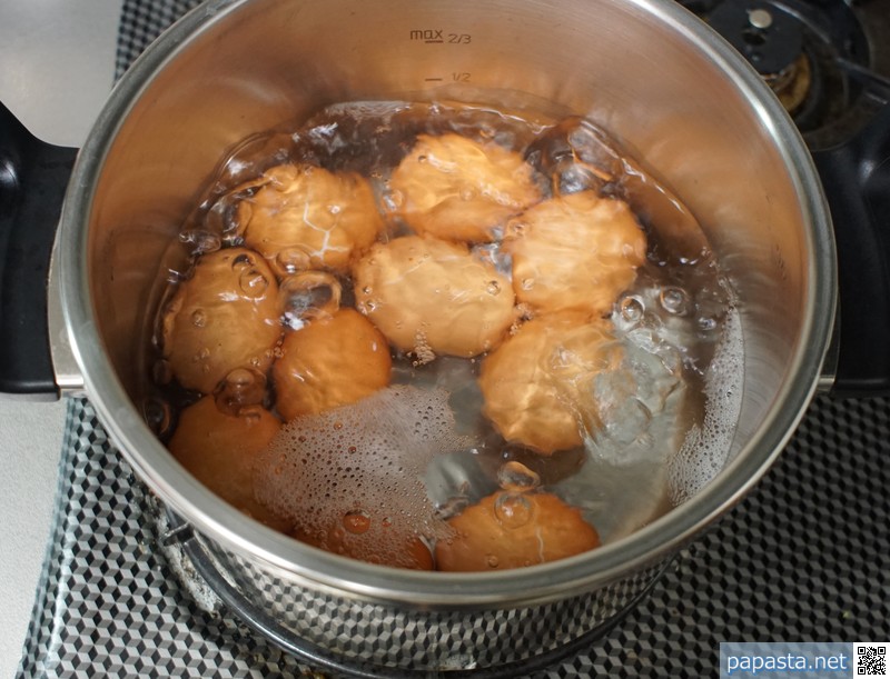 酒、みりん、醤油と砂糖のシンプルな味付けですが、意外においしい。中まで味がしみ込むとラーメン屋の煮卵そのものです