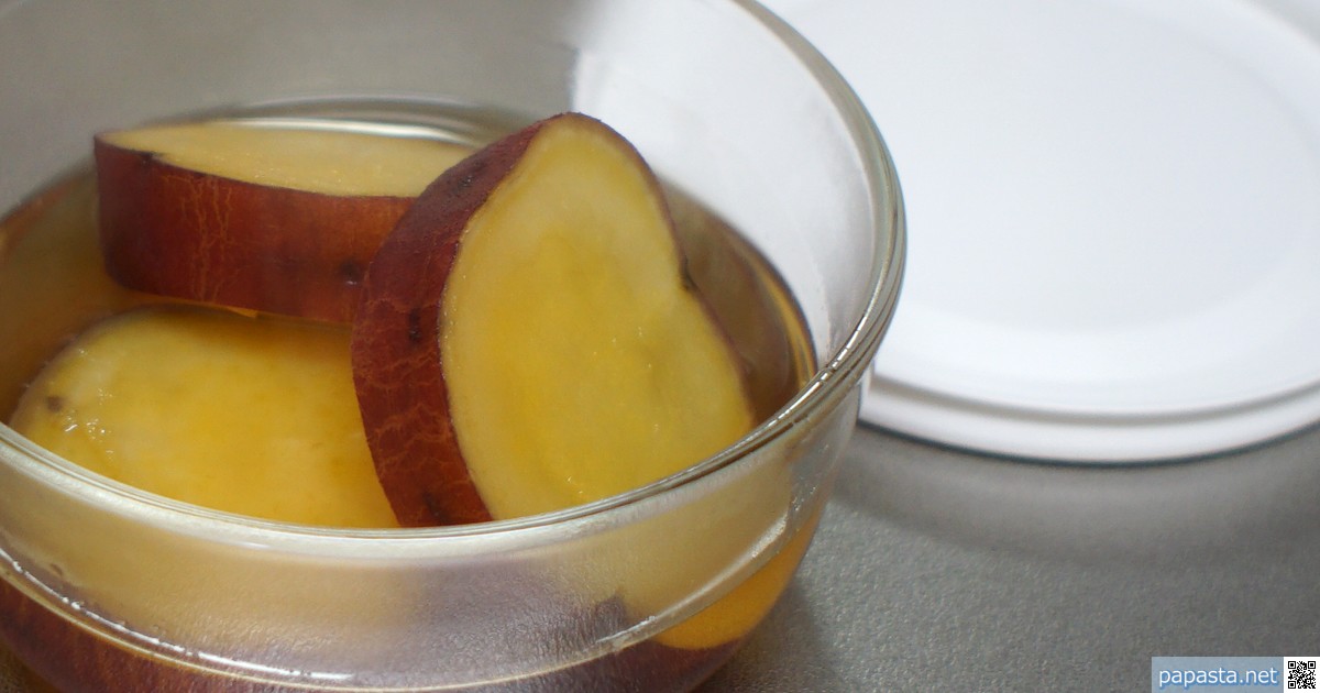 さつまいもは、60~70℃でベータアミラーゼという酵素が活性化し、さつまいもの「デンプン」が「マルトース(麦芽糖)」に分解されるということです。なので、ゆっくり加熱しながら、煮ることで、65℃前後の温度を長い時間保つようにすることで、砂糖なしでもあま~いサツマイモの煮物ができます。うまく出来ると、焼き芋のようなネットリした甘いサツマイモになります