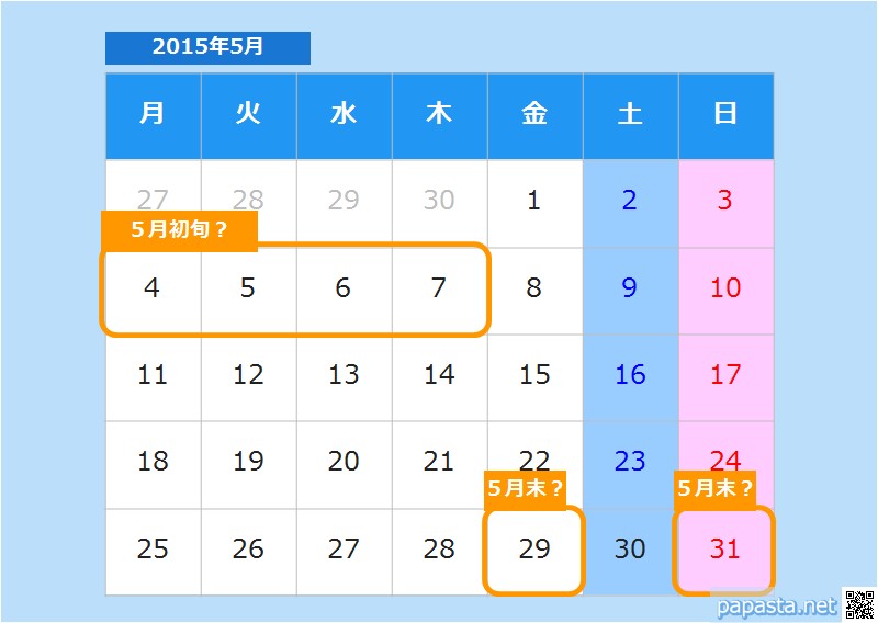 予定だからといって、あいまいにせず、予定日を決めなければなりません。決められなかったらえいやと、とりあえず決めます。具体的には、予定は、10月7日(月)とか4月30日(金)など、具体的な日付をもって決めます