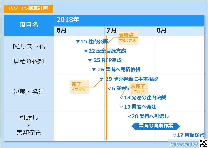 ここでは、不要になったパソコンを産業廃棄物として捨てるプロジェクトを例として考えてみます。余裕を持って計画すると、なんと2ヶ月以上もかかります(会社で産業廃棄物を捨てるのってホントに大変)