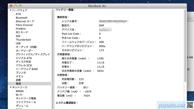 バッテリーの充放電回数も223回。もう古くなって劣化しているのかもしれませんが、満充電から3時間以上連続で利用可能です。