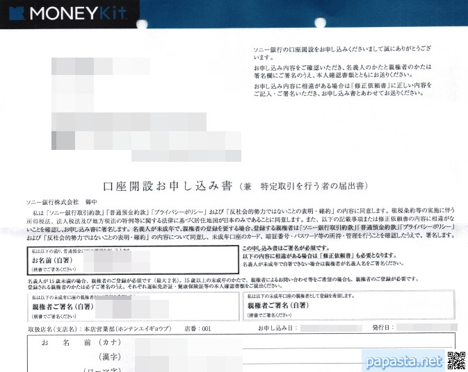 - 8月5日、インターネットで入力した内容がプレ印字された口座開設の申込書が自宅に到着