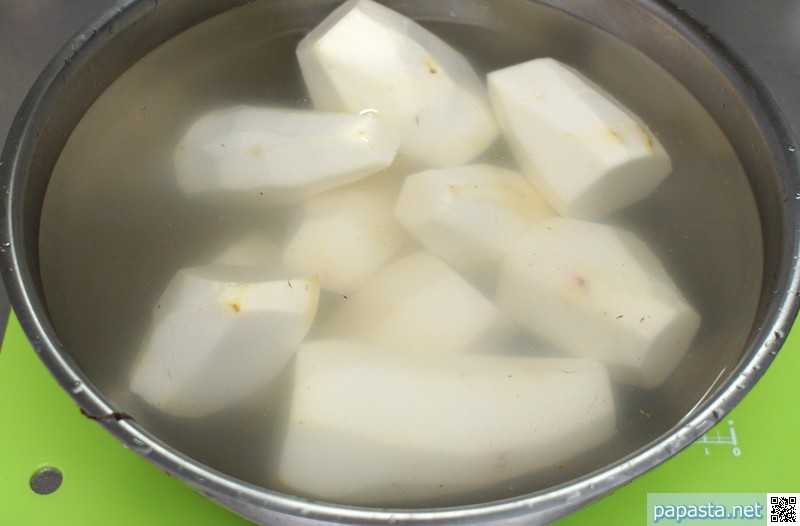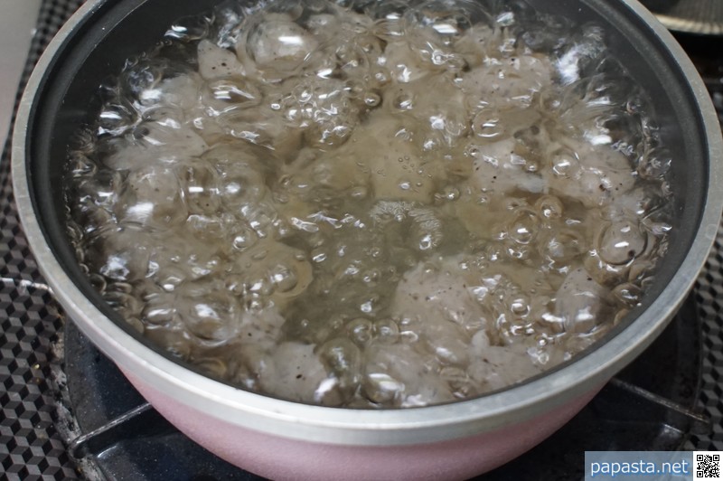 干し椎茸は、5℃前後でゆっくり戻すと、旨味グアニル酸が増えます。僕は、干しシイタケ5個あたり、2カップ(400ml)の水をボウルに入れて、冷蔵庫で丸一日かけて戻します。グアニル酸は10℃超だと分解され戻し汁に旨味が出ないそう。なので、常温(室温)で戻すと旨味が十分に抽出されません