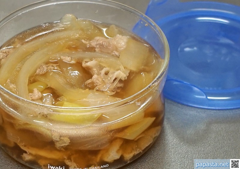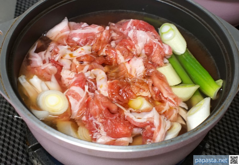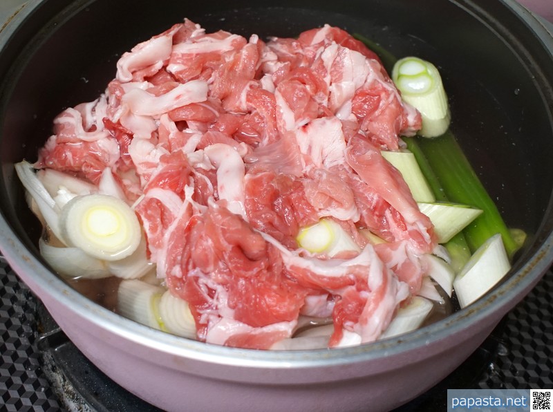 刺激の少ない塩加減でおいしい。つゆの素のかつおだしと豚肉の旨味がお互いの味を引き立てます