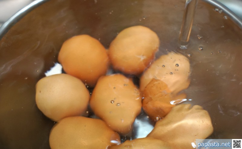 卵のお尻の部分に針で小さな穴をあけると、茹でているときに卵の中の空気が抜けるので、殻と中身の隙間が密着しないで、むきやすくなりますのでオススメです