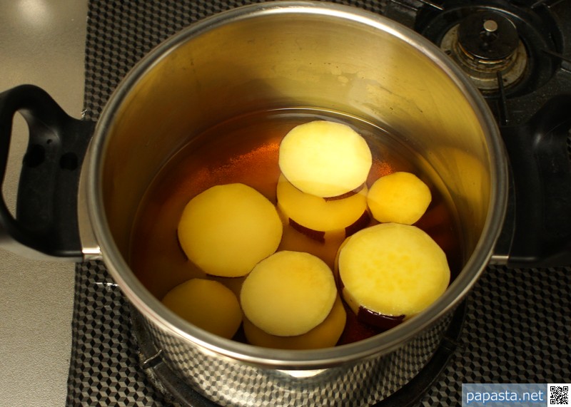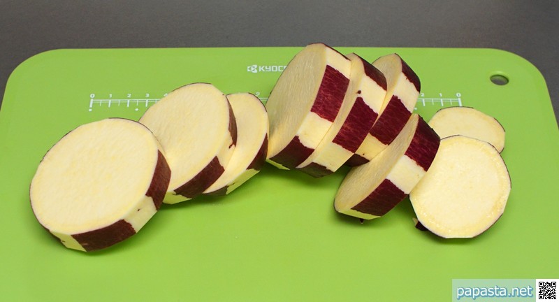さつまいもは、60~70℃でベータアミラーゼという酵素が活性化し、さつまいもの「デンプン」が「マルトース(麦芽糖)」に分解されるということです。なので、ゆっくり加熱しながら、煮ることで、65℃前後の温度を長い時間保つようにすることで、砂糖なしでもあま~いサツマイモの煮物ができます。うまく出来ると、焼き芋のようなネットリした甘いサツマイモになります