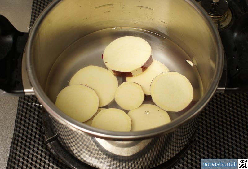 ベータアミラーゼの力を最大限引き出す工夫として、僕はこんな調理方法でサツマイモを煮ます。まず、サツマイモを入れた鍋を弱火にかけて、泡がふつふつ出てきたら(これで大体70℃)火を止めて、手で触れられるくらい冷ます。次に沸騰するまで弱火にかけて、サツマイモに竹串が通るくらい火が通ったら完成。